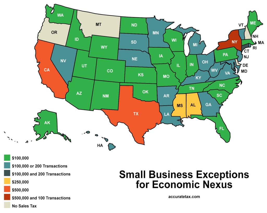 Most states have economic nexus laws as well as a small business exception, but the rules that govern these exceptions vary by state. If your sales meet or exceed the exception threshold for a given state, you are required to register, collect, and remit sales tax to your customers within that state. The following map shows the different exemption thresholds.
